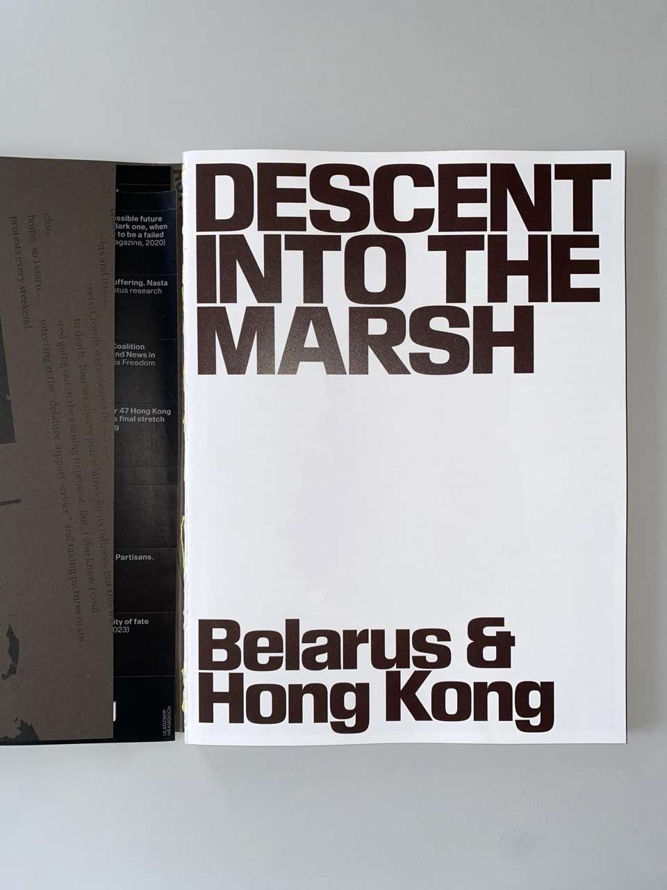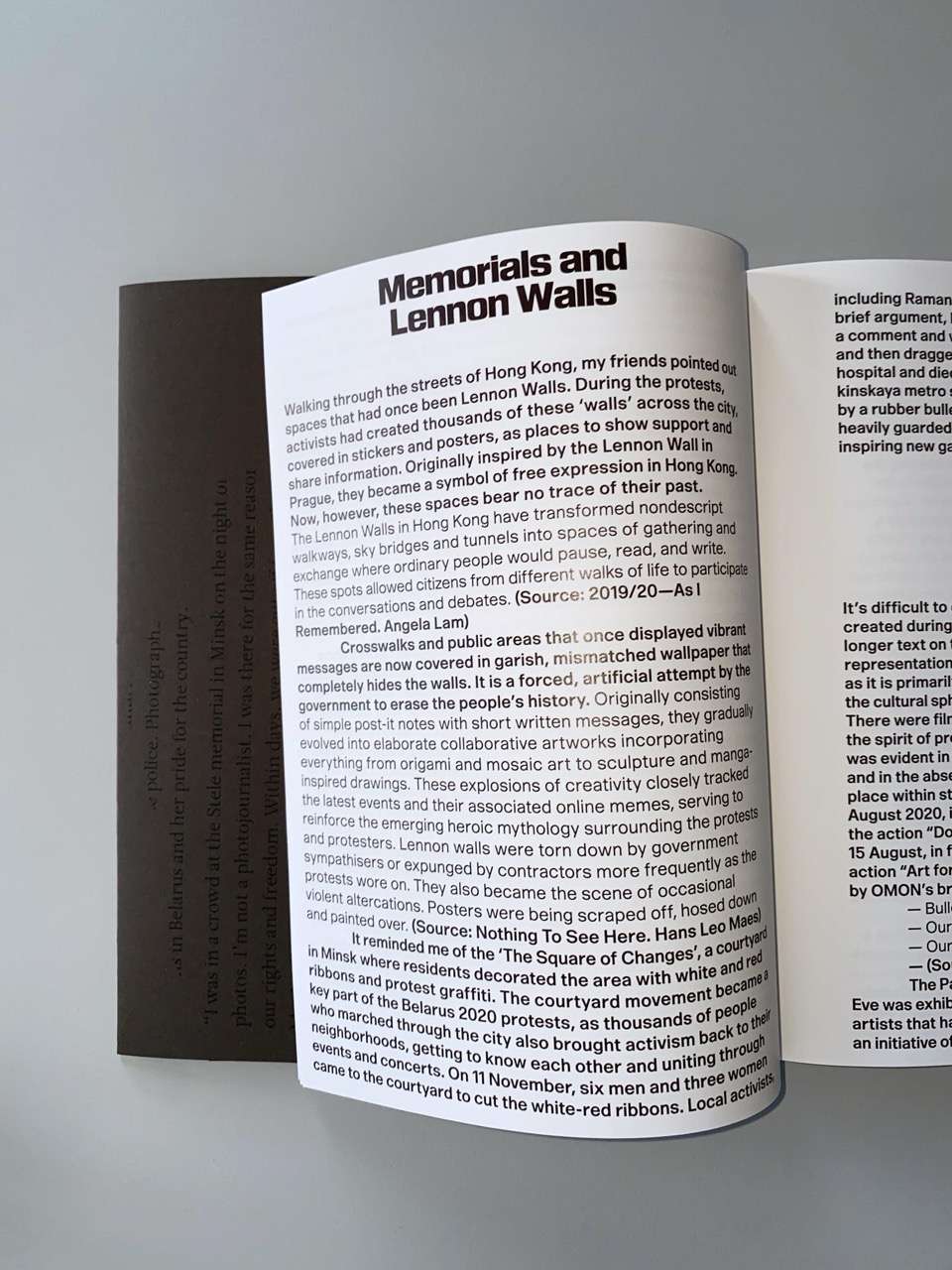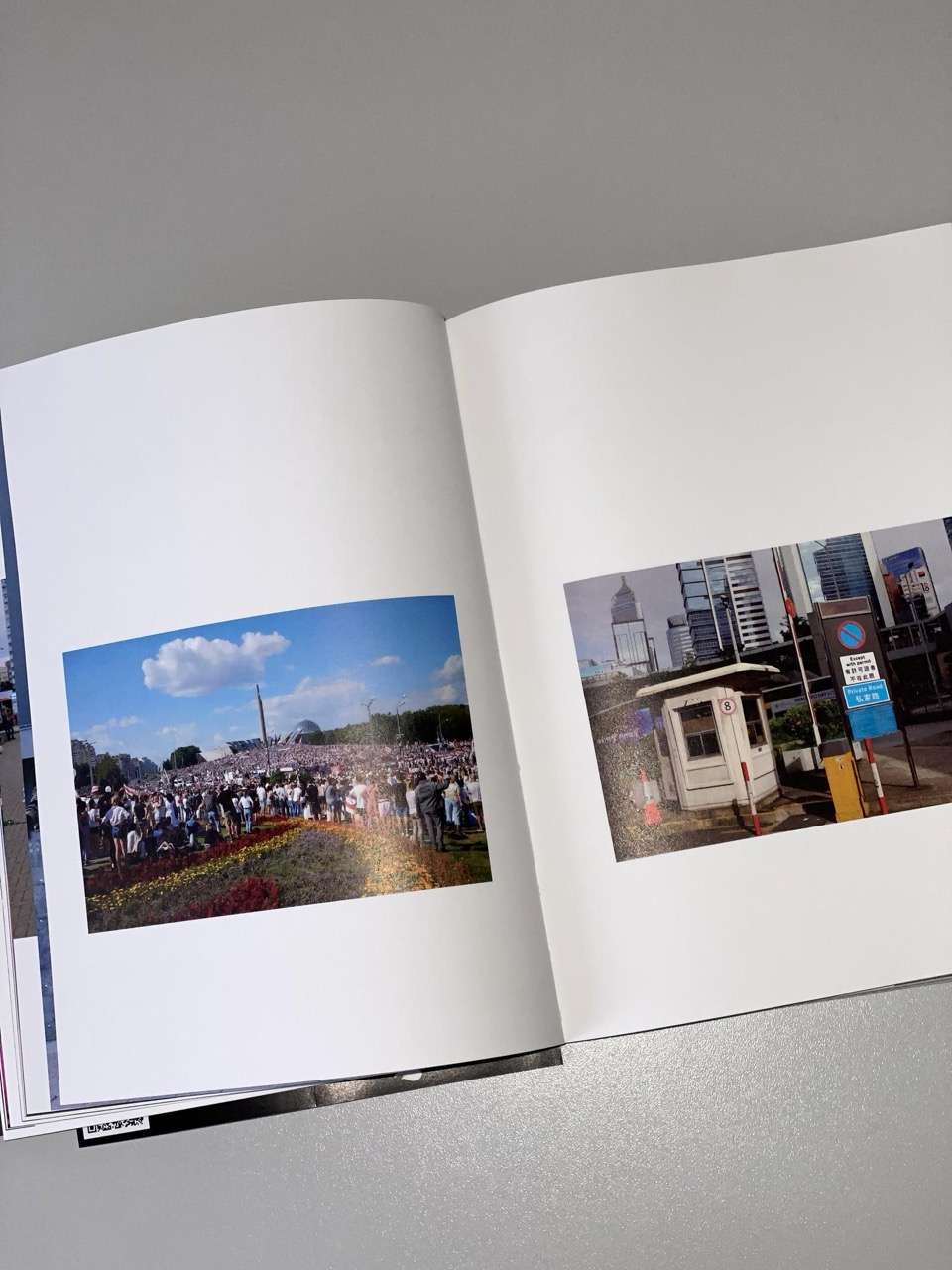 “Archives in Belarus are highly unstable: social media spaces are controlled, most independent Belarusian media websites are blocked, and all news posted on their sites disappear. We remember fragments, but we cannot find a source that describes the details. Symbols, slogans, gestures, colours—something will appear in this book. Articles about the protest that once appeared on the Facebook feed will have their own place on these pages. This book serves as a visual document of the protest movements in Hong Kong from 2019 to 2020 and in Belarus from 2020 to 2021. It’s a work in progress. New links will appear in the form of stickers, and the ones here may become obsolete. Because in 2024 nothing ended. In this book, I combine photos I took in Belarus in 2020a country I cannot yet return to—and photos from 2024 in Hong Kong, a place I could visit to find empty streets and an everyday life that bears only faint traces of the protest movement.”
