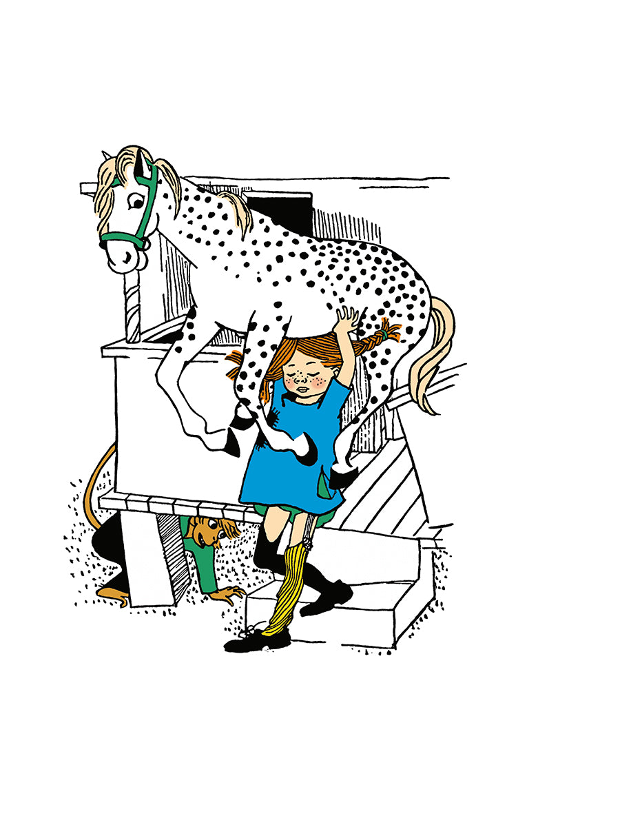Піпі жыве адна на віле “Напракудзіле”, сябруе з канём і малпачкай Спадаром Нільсанам, пячэ бліны ёршыкам і лёгка перамагае Дужага Адольфа.